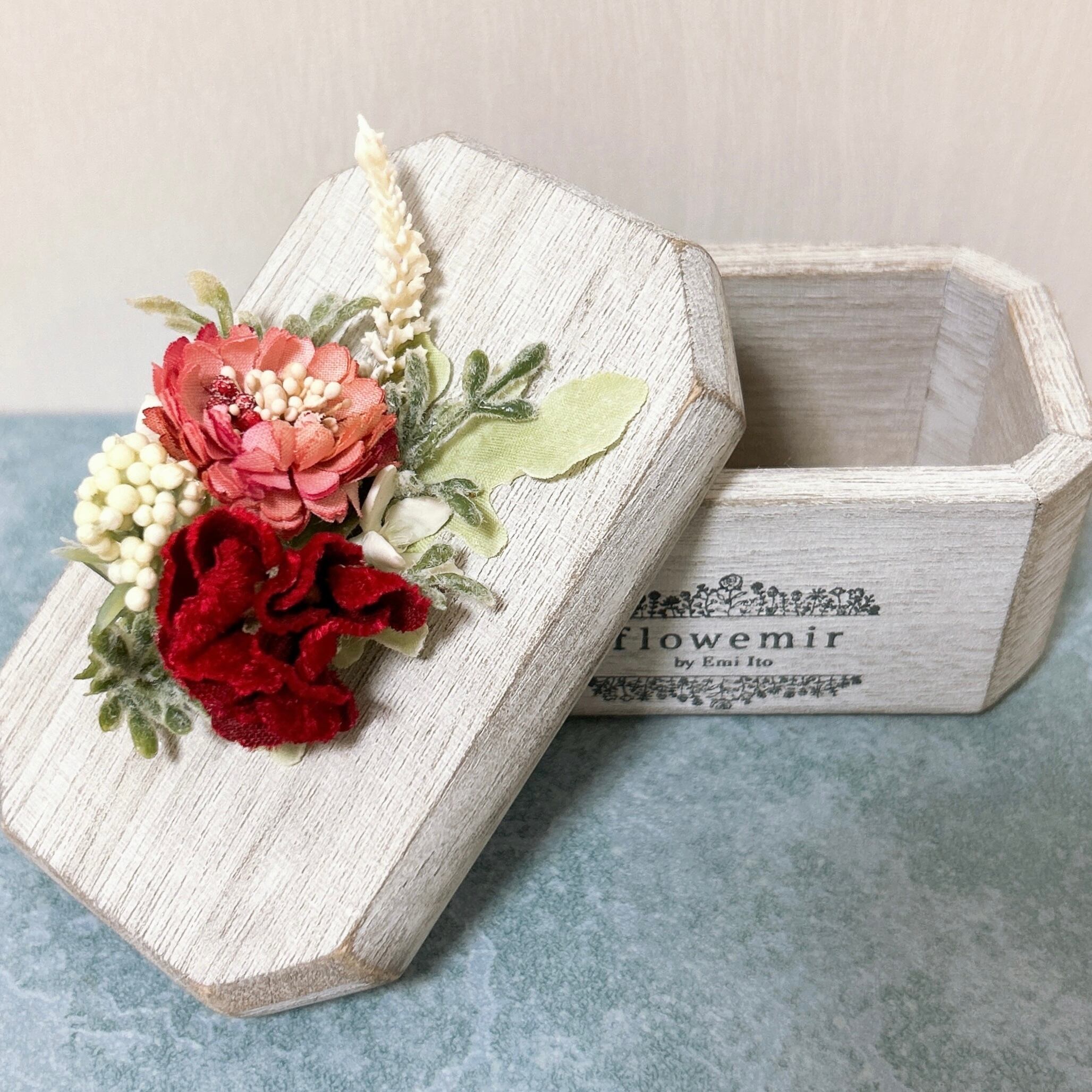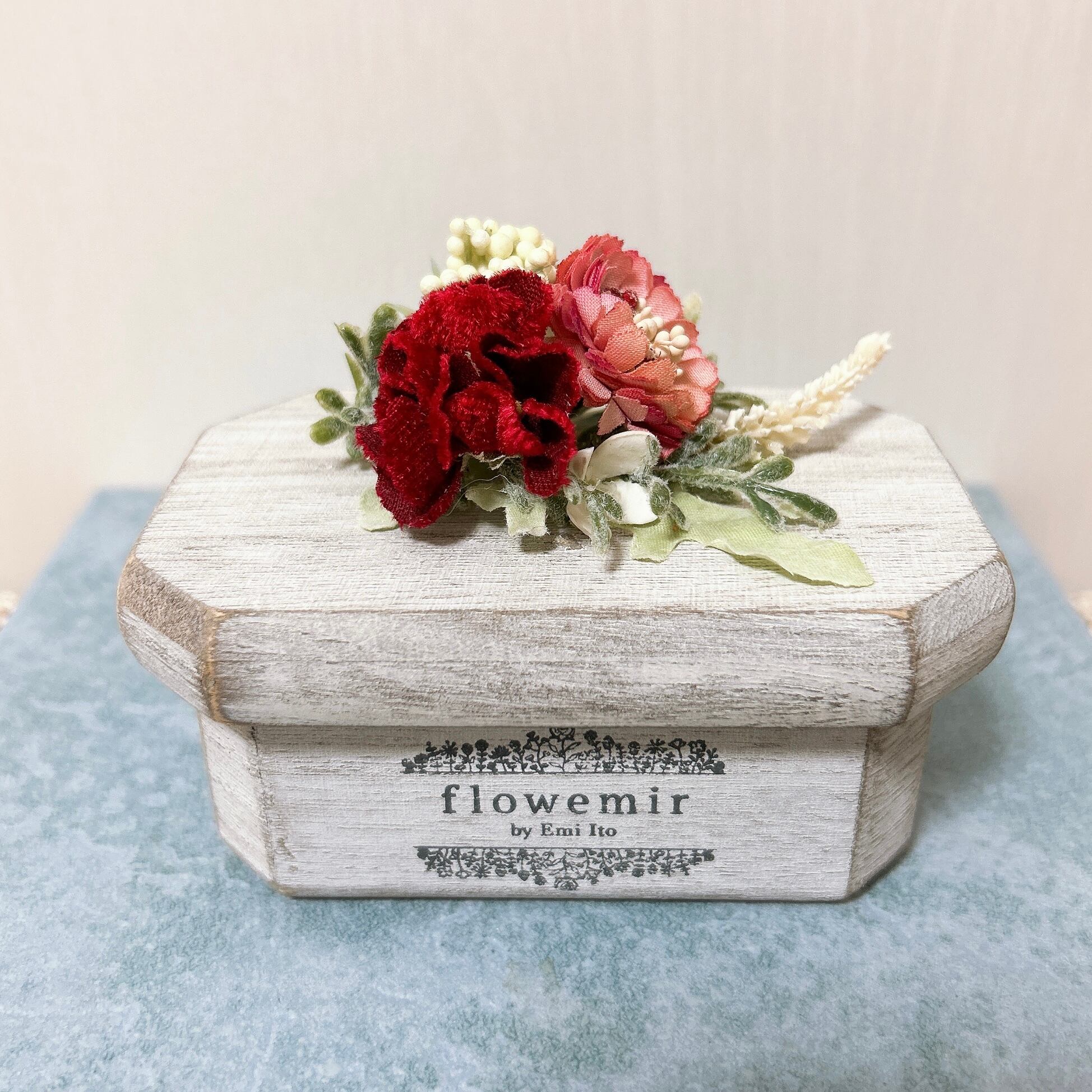 flowemirのロゴ入りの木製の小物入れにアートフラワーのアレンジメントを施しました。