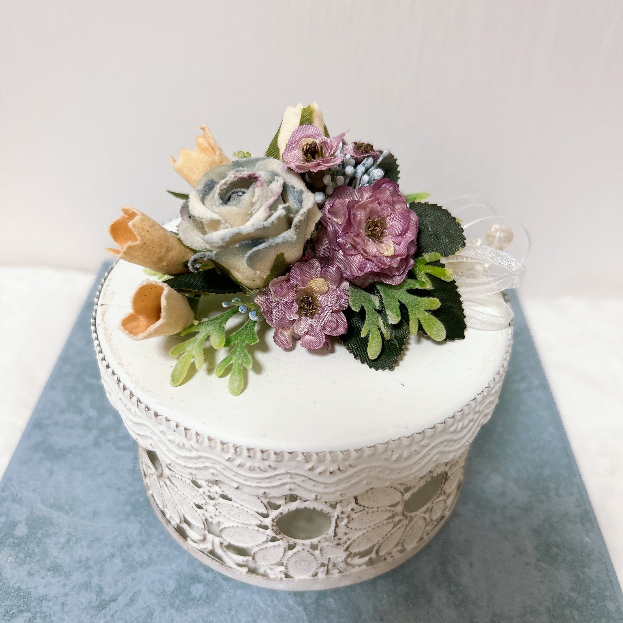 ブリキのアンティーク調の小物入れにアートフラワーのアレンジメントを施しました。